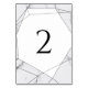 Dieses Design besticht durch elegantes Marmor und geometrische Muster. Die geometrischen Muster überlagern die natürlichen, einfachen Marmorlinien. Die Kombination aus Grautönen, Schwarz und Weiß schafft einen eleganten, trendigen und schicken Stil. Elegantes Hochzeitsdesign mit modernen Elementen in der Tischnummer. Die moderne Gestaltung der Typografie verleiht ihr einen besonderen Stil. Auch die passenden Hochzeitseinladungen und andere Schreibwaren sind verfügbar. Passen Sie die Anzahl an und erwerben Sie jede Tabellennummer individuell, je nachdem, wie viele Tischnummern Sie benötigen.