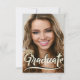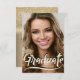 Feiern Sie Ihren Abschluss mit dieser einfachen Script-Foto-Abschlussfeier. Dieses Abschluss-Kartendesign hat ein Foto an der Vorderseite und grad Party Einladung auf der Rückseite auf Gold Glitzer ombre Hintergrund.