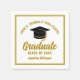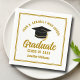 Die elegante Papierserviette der Goldgraduiertenparty mit ihrem Namen als Absolvent der Oberschule oder Uni und der Schule in schicker, kühner Typografie rund um eine moderne schwarze Studentenkappe. Die Einrichtung des Party ist sehr gepflegt.