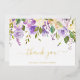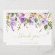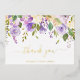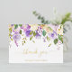 Lila florales Beileid Dankeschön Karte mit einem obersten Rand von Aquarell bemalten Blume in den Tönen Pastellviolett, Lavendel, Lilie und Elfenbein. Unten ist "Danke" in der Schrift zusammen mit dem Familiennamen der Verstorbenen in realer Goldfolie. Die Rückseite hat Ihre personalisierte Nachricht. Eine elegante Wahl, um den Gästen der Beerdigung einer Liebe zu danken.