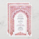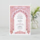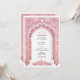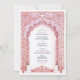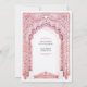 Diese luxuriöse Hochzeitseinladung zeigt einen atemberaubenden Filigree-Bogen aus Gold und Rosa, der durch eine aufwändige Palastarchitektur und barocke Details inspiriert wird. Die wunderschön geprägten Blumenmuster und Skulpturenmuster verleihen dem Ganzen einen zeitlosen Charme, der sich perfekt für elegante, traditionelle und Hochzeiten in Urlaubsort eignet. Die Kombination aus sanften Rosatönen und luxuriösen Goldverzierungen verleiht der Einladung eine raffinierte Anziehungskraft, die sich ideal für Paare eignet, die ein opulentes und künstlerisches Hochzeitsthema suchen. Die raffinierte Typografie fügt sich nahtlos in den verzierten Rahmen ein und sorgt für ein atemberaubendes und unvergessliches Hochzeitspapierdesign.