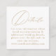 Ermöglicht es den Gästen, mit diesen modernen QR-Code Hochzeitsdetails Einzel-Karten einfach mehr Informationen über Ihre Hochzeit zu finden. Die elegante Hochzeitsdetails-Karte zeigt "Details" in einem goldenen Kalligraphie-Skript, das mit einem weißen Hintergrund kontrastiert. Personalisieren Sie die Karte mit Ihrer Hochzeitswebsite-Adresse und individuellem Text. Auf der Rückseite der Gold-Hochzeitskarte finden Sie einen QR-Code, mit dem Sie nach Informationen über Hotelunterkünfte, Anfahrtszeiten, Kleiderordnung, Online-UAWG usw. suchen können.