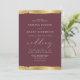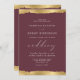 Diese trendige Hochzeitseinladung enthält eine goldene Imitat-Folie, die am oberen und unteren Rand auf einem bordeauxroten Hintergrund abgerissen ist. Das Wort "Hochzeit" erscheint in kalligrafischer Schrift. Passen Sie den weißen Text mit den Namen der Braut und des Bräutigams und den Einzelheiten der Hochzeit an. Die goldene Kante wird auf der Rückseite wiederholt.