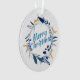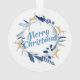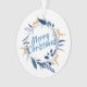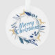 Dieser elegante Weihnachtsschmuck besticht durch einen Kranz mit goldenen Rentieren und blau-grauem Grün. Frohe Weihnachten ist in einem schönen handgeschriebenen Skript geschrieben.