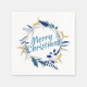 Diese elegante Weihnachtsserviette besticht durch einen Kranz mit goldenen Rentieren und blauen und grauen Pflanzen. Frohe Weihnachten ist in einem schönen handgeschriebenen Skript geschrieben.