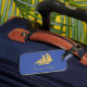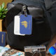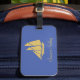 Elegante goldene Segelyacht auf blauem Hintergrund Bag Gepäcktag. Text kann angepasst werden.