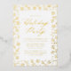 Elegante Feier Einladung mit einem Rand von goldenen Schneeflocken und Kiefernästen auf weißem Hintergrund. "Holiday Party" wird in einer Goldfolie-Kalligraphie-Skript mit Ihren Party-Details angezeigt. Die Einladung zur Snowflake-Feier kehrt um, um ein schönes Schneeflockenmuster zu zeigen.