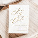 Elegant Save the Date mit "Save the Date" in einem goldenen Kalligraphieskript mit weißem Hintergrund dargestellt. Personalisieren Sie die Kalligraphie Save the Date mit Ihren Namen, Hochzeitstag und Ort, und Hochzeitswebsite. Das nicht-Foto Design koordiniert mit unserer Hochzeitskollektion Elegant Calligraphy.