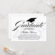 © Sozialite Designs. Unser elegantes Drehbuch / Kalligrafie "Graduate" Text und Graduierung Kappe, mit schwarzem Text auf weißem Hintergrund, fügen eine Touch von schlichter Eleganz zu diesem Abschluss Einladung. Der Hintergrund hat ein subtiles graues Jahr von Abschluss Wasserzeichen. Die Rückseite der Einladung hat ein elegantes Ornament-Design mit "Class of" und Jahrestext. Ersetzen Sie einfach unseren Vorlagentext für Ihre Veranstaltung.