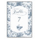 Elegantes und verziertes Vintag-weiß-blauer Toile-de-jouy-Hintergrund-Muster mit exotischen Blume, Weinreben und Blättern, verwoben mit Garland und Körben von Rose mit maßgeschneidertem Etikett, eleganter Schriftzeichen, Blumenstrauß und bearbeitbarem Textfeld für Ihre Tischnummer. In Kollektionen finden Sie passende Produkte im Shop von GrafixMom.