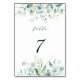 Diese Tischnummer ist mit Aquarellfarben eukalyptus, botanischem Grün und hellblauen Blätter mit moderner Kalligraphie gestaltet.