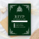 Elegante RSVP-Karte mit einem verzierten, eleganten Rahmen und "Bismillah" in arabischer Kalligrafie vor dunkelgrünem Hintergrund.
