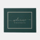 Eleganter Empfang Doormat mit einem beigen Skript auf grünem Hintergrund. Personalisieren Sie Ihre Daten mit Ihrem Familiennamen oder Text.