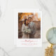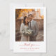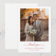 Dies ist ein Bild im romantischen Stil, das ein wunderschön gekleidetes Paar zeigt, das zusammen in einer Außenkulisse steht und in warmes goldenes Sonnenlicht getaucht ist. Die Braut hält einen atemberaubenden Blumenstrauß aus weißen und grünen Blumen, während der Bräutigam neben ihr in einem stilvollen Anzug steht. Der Hintergrund zeigt historische Steinarchitektur, die der Szene einen Hauch zeitloser Eleganz verleiht. Unten ist "Danke" elegant in Rot geschrieben, gefolgt von den Namen Lauren & Benjamin und ihrem Ort, Atlanta, Georgia. Es strahlt Wärme, Dankbarkeit und Feier aus und ist somit perfekt, um Gästen nach einer Hochzeit herzlichen Dank auszudrücken.