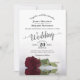 Diese wunderschöne Hochzeitseinladung besticht durch ein modernes Blumendesign mit einem Single, der in Bordeaux, Maronade oder in Weinrot gefärbte Rose eingebettet ist und in einem mit Wellen und Wellen geschmückten Pool reflektiert wird. Das Design ist einfach, elegant, romantisch und raffiniert, mit einer laky Skriptkalligraphie und vollständig anpassbaren Inhalten.