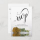 Diese wunderschönen RSVP-Karten machen es Ihren Gästen leicht, auf Ihre Hochzeitseinladung zu reagieren. Sie zeichnen sich durch ein elegantes Design mit extravaganter Skriptkalligraphie und einer Single lang gestempelten goldfarbenen Rose aus, die in einem Wasserbecken mit Wellen und Wellen reflektiert wird. Auf der Rückseite der Karte können Ihre Gäste ausfüllen und zurückkommen, indem sie angeben, ob sie teilnehmen können oder nicht, die Anzahl der Gäste, die sie mitbringen, und ihre Wahl der Mahlzeiten. Es gibt auch Platz für eine Website, damit Ihre Gäste online antworten können, wenn es für sie bequemer ist.