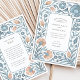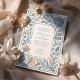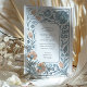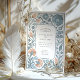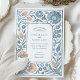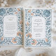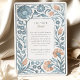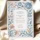 Das atemberaubende Blumengesteck, das von Iznik oder Osmanischer Kunst inspiriert wird, lädt Sie ein, Ihren besonderen Tag mit dieser exquisit gestalteten Hochzeitseinladung zu feiern. Das Kunstwerk präsentiert eine harmonische Mischung aus stilisierten Blume und Blattwerk in einer raffinierten Farbpalette. Hervorzuheben sind große, mehrblättrige staubblaue Blumen, die an stilisierte Nelken oder Chrysanthemen erinnern, und ähnliche große Blüten in einer weichen, gedämpften Pfirsich- oder Aprikosenfarbe. Ergänzt werden diese durch elegante, schlanke Tulpen/Aprikosen-Blume und Haufen aus kleinen, zauberhaften blauen, daisy-ähnlichen Blume. Das aufwändige Design zeichnet sich durch sanft kurvenreiche blau-graue Blätter und Stiele aus, die einen luxuriösen Rahmen rund um die zentrale Textanzeige schaffen. Diese mit einer subtilen Textur, die an handgemalte Keramiken oder Vintage botanische Drucke erinnert, verleiht dieser Einladung eine besondere Note für Paare, die eine künstlerische, elegante und zeitlose Ästhetik mit einer Touch von historischem Charme suchen. Auf der Rückseite finden Sie "The Finer Details" für weitere Informationen, die von den gleichen schönen Blumenmotiven gerahmt sind.