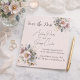 Elegante Rosa, Blau und cremefarbene Blütenhochzeit Save the Date Das Bild zeigt eine wunderschön detaillierte und künstlerische Anordnung von Blume und Blätter. Das Bouquet umfasst große, zarte Blume in Rosa, Blau und Creme, mit aufwändigen Details im Blütenblatt und goldgelben Ziern. Um die Blume herum gibt es verschiedene Blätter in gedämpften Tönen von Grün, Gold und Beige, sowie kleine Knospen und Blätter. Die Komposition ist elegant und ausgewogen, mit einer weichen, pastellfarbenen Palette, die ihm ein ruhiges und elegantes Aussehen verleiht.