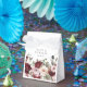Elegante Hochzeitsgeschmacksbox mit schönen Aquarellblumen in tiefburgundischen Rot- und Rosa-Farbtönen, die mit einem üppigen Salbeigrün und anderen botanischen Blättern besticht. Alle Texte und Schriftart sind auf diesem romantischen Design editierbar.