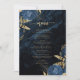 Dieses elegante Hochzeitsmenü mit blauen Blumenstrauß-Sets und goldfarbenem Imitat in zwei Ecken, auf einem Hintergrund von marineblau-blauem Aquarell. Der benutzerdefinierbare Text kombiniert goldfarbene Serif- und Handschriftzeichen mit Schriftart. Die Rückseite ist mit einem blauen und goldenen Blumenmuster und einem gelben Design ausgestattet.