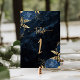 Diese elegante Hochzeitskarte mit blauen Blumenstrauß-Set mit goldenen Imitate-Folie in zwei Ecken, auf einem Hintergrundbild von marineblauen Aquarellen. Der anpassbare Text enthält das Wort "Tabelle" und eine bearbeitbare Tischnummer in goldfarbenem Schriftart.