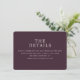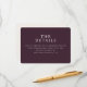 Diese Hochzeitseinlagekarte verfügt über ein anspruchsvolles, minimalistisches Design mit einem tief-marronfarbenen Hintergrund, der Eleganz und Raffinesse ausstrahlt. Das Layout ist zentriert und ausgewogen und verwendet eine saubere Typografie in einer klassischen Serifenschriftart, um wesentliche Informationen klar zu vermitteln. Die Stimmung ist professionell und modern, was sie perfekt macht, um Gäste zu weiteren Details über die Veranstaltung zu leiten. Ihre einfache und dennoch stilvolle Ästhetik sorgt dafür, dass sie sich nahtlos in jedes Hochzeitsthema einfügt.