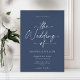 Diese elegante Hochzeitseinladung der Marine besticht durch ein elegantes Skriptdesign mit einem modernen Kalligraphie-Schriftart. Der tiefe Marinehund schafft einen zeitlosen und eleganten Look, der sich perfekt für eine romantische und stilvolle Hochzeit eignet. Personalisieren Sie es mit Ihren Daten für eine schön angepasste Touch. Ideal für formelle, klassische und zeitgenössische Hochzeitsthemen.