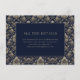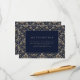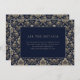 Dies ist ein Bild im klassischen Stil mit einer eleganten Hochzeitseinladungskarte mit aufwendigen Blumenmustern in Gold und Marineblau. Das reiche, luxuriöse Design strahlt Raffinesse und zeitlose Eleganz aus und ist somit perfekt, um die Details Ihres besonderen Tages zu vermitteln. Das zentrale Textfeld bietet einen klaren Raum, um wichtige Informationen über Unterkünfte und weitere Hochzeitsdetails zu teilen und die Gäste auf die Website des Paares für weitere Informationen zu verweisen. Es weckt Gefühle der Vorfreude und Aufregung und setzt den Ton für eine unvergessliche Feier.