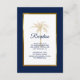 Mit dieser eleganten Einschließkarte mit modernem Drehbuch, marineblarem Text, inklusive einer goldenen Palme und einem vergoldeten Metallrahmen auf der Vorderseite der Karte, erhalten Sie alle Details Ihrer Hochzeitsfeier. Ein marineblau Hintergrund ist vorne und hinten.