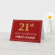 Die Vorderseite dieser angesehenen und luxuriösen Geburtstagskarte zeigt eine große Ordnungsnummer "21." mit einem inspirierten Imitation/Imitat-Look, die Meldung "HAPPY 21ST BIRTHDAY", einen benutzerdefinierten Empfängernamen und ein Randmuster, das aus dünnen Linien auf einem roten Hintergrund besteht. Im Inneren befindet sich eine individuell angepasste Geburtstagsgrüßbotschaft, oder man könnte sie löschen und leer verlassen werden, wenn eine Nachricht von Hand geschrieben werden soll. Eine bearbeitbare Geburtstagskarte wie diese könnte dazu verwendet werden, den einundzwanzigsten Geburtstag von jemandem zu bestätigen. [~Z0000467]