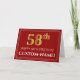 Die Vorderseite dieser extravaganten und eleganten Geburtstagskartengestaltung weist eine große Ordnungsnummer mit einem inspirierten Erscheinungsbild aus Imitation/Imitaten, der Meldung "HAPPY 58 TH BIRTHDAY", einem benutzerdefinierten Empfängernamen und einem Randmuster aus dünnen Linien auf rotem Hintergrund auf. Im Inneren befindet sich eine benutzerdefinierte Geburtstagsgrüßbotschaft, oder man könnte sie löschen und leer verlassen werden, wenn eine Nachricht von Hand geschrieben werden soll. Eine personalisierte Geburtstagskarte wie diese könnte verwendet werden, um jemandes achtundfünfzigsten Geburtstag zu bestätigen. [~Z0000467]