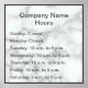 Dieses elegante Imitat Marmor Poster hat dunkelgraue Darstellungstexte, die Sie bearbeiten können, um die richtigen Informationen zu zeigen. Oben befindet sich eine Zeile großen grauen Textes, den Sie durch Ihren Firmennamen ersetzen können. In der nächsten Zeile steht "Stunden" (Sie können Stunden bearbeiten, wenn gewünscht). Unter den beiden Zeilen großen grauen Textes gibt es sieben Zeilen mit kleinerem grauem Text für jeden Tag der Woche. Sie können die Stunden für jeden Tag ändern, wenn nötig.