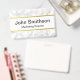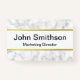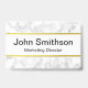 Dieses Abzeichen aus weißem Marmor hat schwarzen Text und eine goldene Imitat-Zeile über und unter dem Text. Personalisieren Sie es mit Ihrem Text wie Name und Titel.