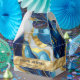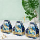 Eine Gastgeschenk Hochzeit mit einem goldfarbenen, blau-weiß-marmorierten Imitat.