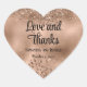 Dieser Aufkleber enthält die Meldung "Liebe und Dank" mit dem Namen und dem Hochzeitstermin der Braut und des Bräutigams auf einer Rose Gold Glitzer und Folie Hintergrund.