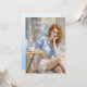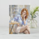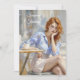 Elegante junge Dame in Blau und Weiß in einem Café Einladung