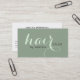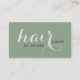 Elegantes, feines, einfaches, farbiges Visitenkarten-Template für die Haare. Hellgrüne Kalligraphie auf einem grünen und weißen Hintergrund auf der umgekehrten Seite mit QR-Code.