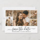 Elegantes, modernes Minimalistisches Kalligraphieskript 5 Fotocollage Speichern Sie die Datumskarten in Schwarzweiß. Dieses zarte romantische Design ist perfekt für eine moderne Hochzeit. Enthält 5 (fünf) Grid-Foto Collage, eine whimsical Kalligraphie in handgeschriebenen Stil Swash Schwanz Schriftart. Einfach mit Ihren Hochzeitsdetails und Fotos personalisieren.