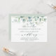 Diese Hochzeitseinladung enthält gemalte Aquarelltöne, botanisches Grün und hellblaue Blätter mit moderner Kalligraphie.