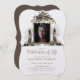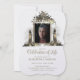 Feiern der Einladung zum Leben mit Foto, umgeben von goldenen Kerzen und Foto inmitten von schicken Schrift Typografie vor Cream Weiß Hintergrund vorne und dunkles Gold im Hintergrund.