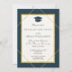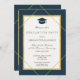 Klassische formelle elegante Stil dunkelmarineblau und weiß Abschlussfeier Einladung mit einem goldenen geometrischen Rahmen und Grau Hut.