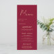 Diese Hochzeitskarte zeichnet sich durch eine atemberaubende Kombination aus modernem Design und eleganter Kalligraphie aus. Der fette, bordeauxfarbene Hintergrund ist die perfekte Kulisse für den wunderschön geschriebenen Text und schafft ein raffiniertes und stilvolles Aussehen. Das Design ist einfach und vielseitig, sodass es einfach ist, sich mit einer Vielzahl von Hochzeitsthemen und Farbschemata abzustimmen. Und wenn Sie eine andere Farbe bevorzugen, ist das Design komplett anpassbar, um Ihren einzigartigen Geschmack und Ihre einzigartige Sehkraft zu erfüllen. Mit dieser atemberaubenden und vielseitigen Speisekarte können Sie Ihr Hochzeitsessen noch angenehmer gestalten.