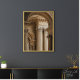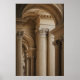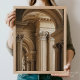 Dieses Plakat fängt die zeitlose Eleganz klassischer Architektur durch eine reich detaillierte Darstellung korinthischer Säulen ein. Die kannelierten Schäfte erheben sich mit monumentaler Anmut, gekrönt von aufwendigen Kapitellen, die mit Akanthusblättern und Voluten verziert sind. Darüber rahmen eine Reihe von Steinbögen und dekorativen Gesimsen die Perspektive und führen das Auge entlang einer rhythmischen Prozession von Säulen. Die warmen Sandstein-Töne und das Zusammenspiel von Licht und Schatten betonen die Textur und Handwerkskunst und rufen ein Gefühl von Beständigkeit, Ordnung und Schönheit hervor, das in der antiken römischen und griechischen Tradition verwurzelt ist.