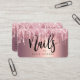 Dieses wunderschöne Nails-Techniker Visitenkarte Design verfügt über Imitat rosa und Kupfer Rose Gold Tropfen Glitzer metallische Textur und elegante Kalligrafie Schriftart.