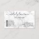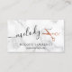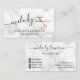 Moderne und elegante Visitenkarten für Friseursalons mit Imitaten aus Kupfer-Rose-Goldschere, weißem Marmorhintergrund und elegantem Kalligraphie-Schriftart.