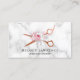 Moderne und elegante Visitenkarten für Friseursalons mit Imitaten aus Kupfer-Rose-Goldschere, Rosa und Weiß-Rosen, weißer Marmortextur und elegantem Kalligraphie-Schriftart.