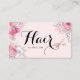 Moderne und elegante Terminkarte für Friseursalons mit Imitaten Kupfer-Rose-Goldschere, Rosa-Weiß-Rosen und elegantem Kalligraphie-Schriftart.