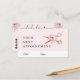 Moderne und elegante Terminkarte für Friseursalons mit Imitaten Kupfer-Rose-Goldschere, Rosa-Weiß-Rosen und elegantem Kalligraphie-Schriftart.