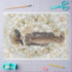 Eine hübsche und sehr hübsche junge Frau steht vor einem zarten Feld von Blume und prächtigen goldenen Kränzen im Barockstil. Die Frau ist in einem eleganten braunen Samtkleid bis zu ihren Heelsen gekleidet, auf ihrem Kopf hat sie einen luxuriösen, breit brillanten Hut mit zarten braunen und gelben Federn, und auf ihren Schultern ein teures Kap mit Pelztrim. William Morris Tapete Design. Dekoutenpapier