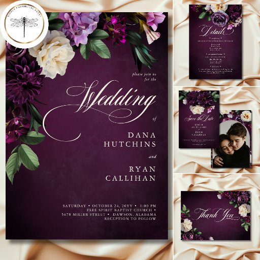 Treten Sie ein in ein Reich exquisiter Eleganz mit unserer blumenddunklen und launischen Hochzeit speichern Sie die Datums-Foto-Karte. Diese Einladung ist so konzipiert, dass sie die Sinne bezaubert und mit einem weinroten Hintergrund geschmückt ist, der mit einem atemberaubenden Blumenstrauß in tiefburgund, Lavendel, Lilie, cremefarbenen Tönen verziert ist, ergänzt durch ein üppiges, dunkelgrünes Blattwerk. Der cremefarbene, elegante Skripttext verleiht dem Ganzen eine romantische Touch. Ihr Lieblingspaare Foto nimmt die Rückseite. Genießen Sie die Opulenz der kräftigen Töne und das Set für Ihren besonderen Tag mit diesem atemberaubenden Design, um Ihren Gästen einen bleibenden Eindruck verlassen. Erstellt von der einfachen Farmhouse Press.